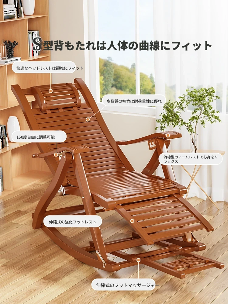 大人用折りたたみ竹製リクライニングチェア|快適な昼寝用|涼しげなデザインのラウンジチェア|バルコニーに最適|座れる・寝られる2WAYロッキングチェアで至福のひとときを!