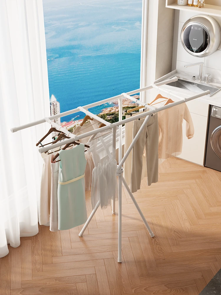 折りたたみ式バルコニー用衣類干しラック - スペースを取らず、ダブルポールデザインで効率的に衣類を干せる!室内にもぴったりな簡易型・頑丈な衣類・帽子ハンガーです。