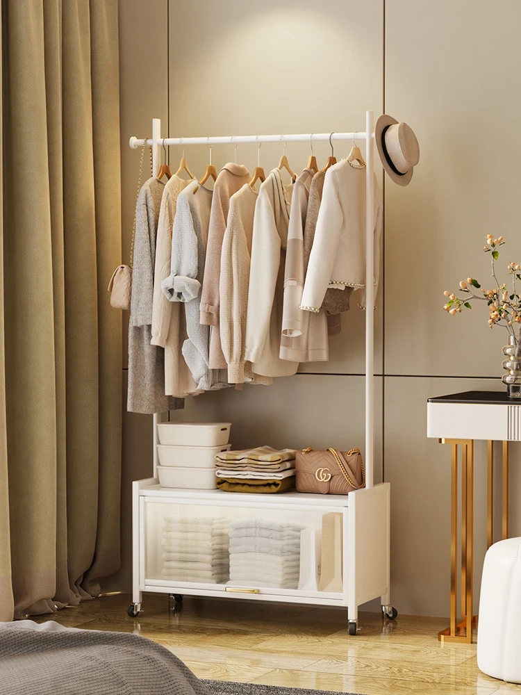新作!多機能&移動式衣類ハンガー - 寝室にぴったりなスタイリッシュな床置きハンガー!ベッドサイドでの衣類収納をスマートに解決。お部屋をスッキリ整頓して、毎日のコーディネートを楽しもう!