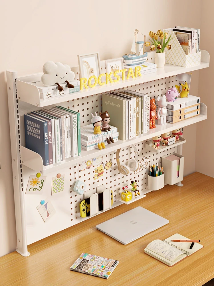学生のためのマルチ機能デスク!おしゃれな書棚と収納ラックが一体化した、効率的な学習デスク。デスク上の整理整頓をサポートし、作業空間をスッキリ保つ穴あきボード付き!勉強や仕事が捗る最適なアイテムです。