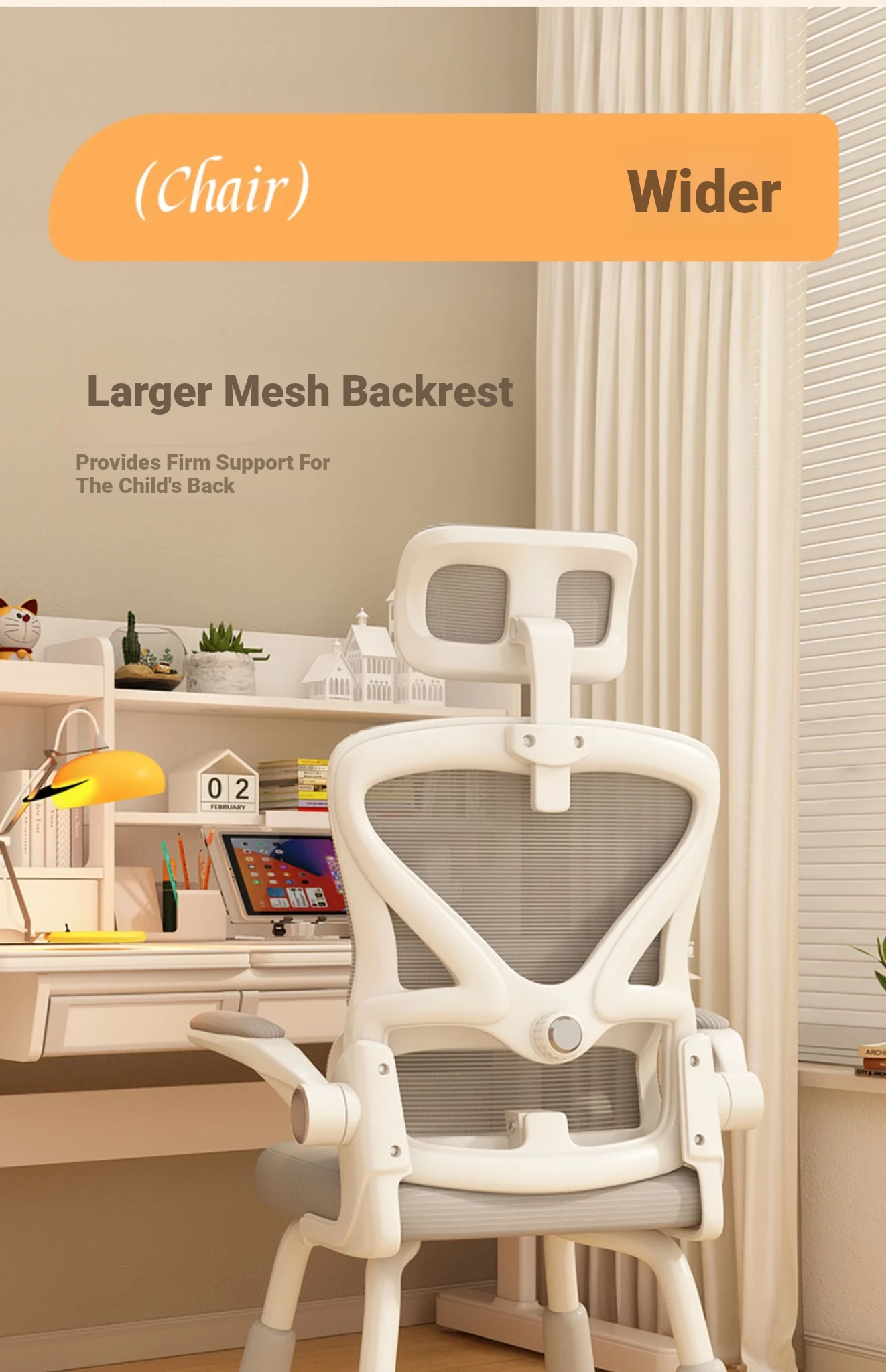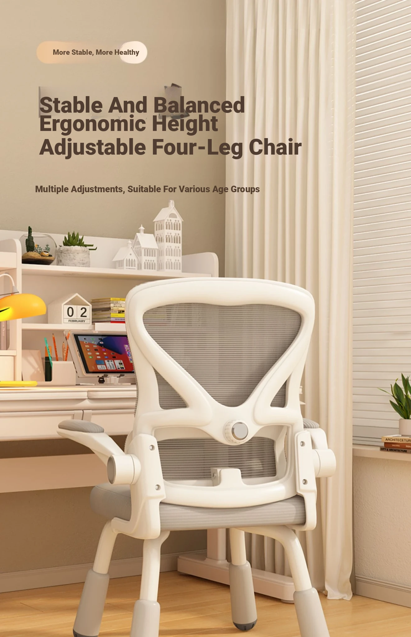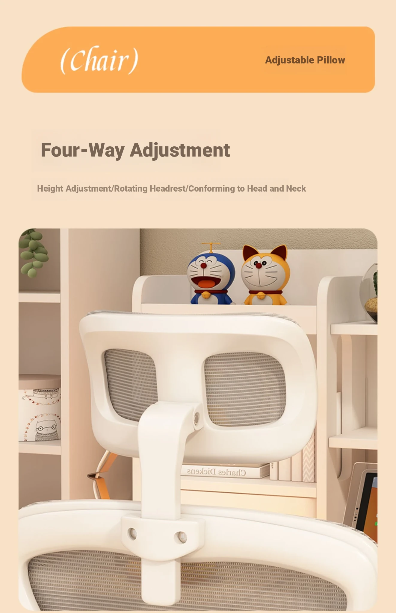 (White frame gray net + liftable headrest) suspended waist support, thickened sponge cushion, firm and thick Adjustable legs