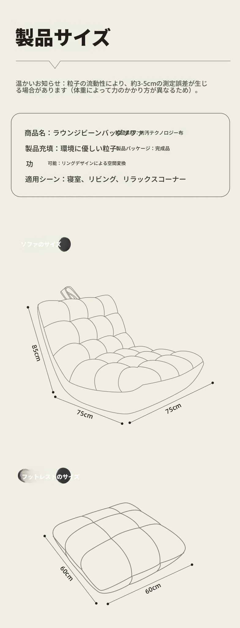 【高反発アップグレード充填】クリームホワイトの大サイズ+フットレスト【防水防汚テクノロジー布】