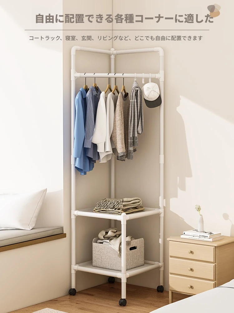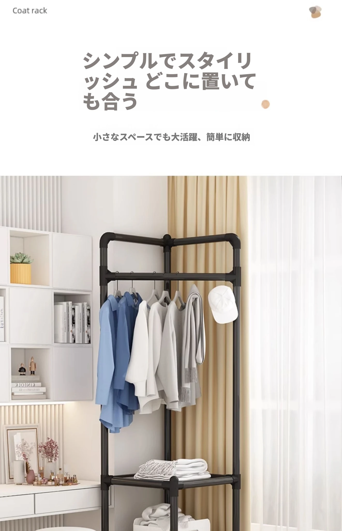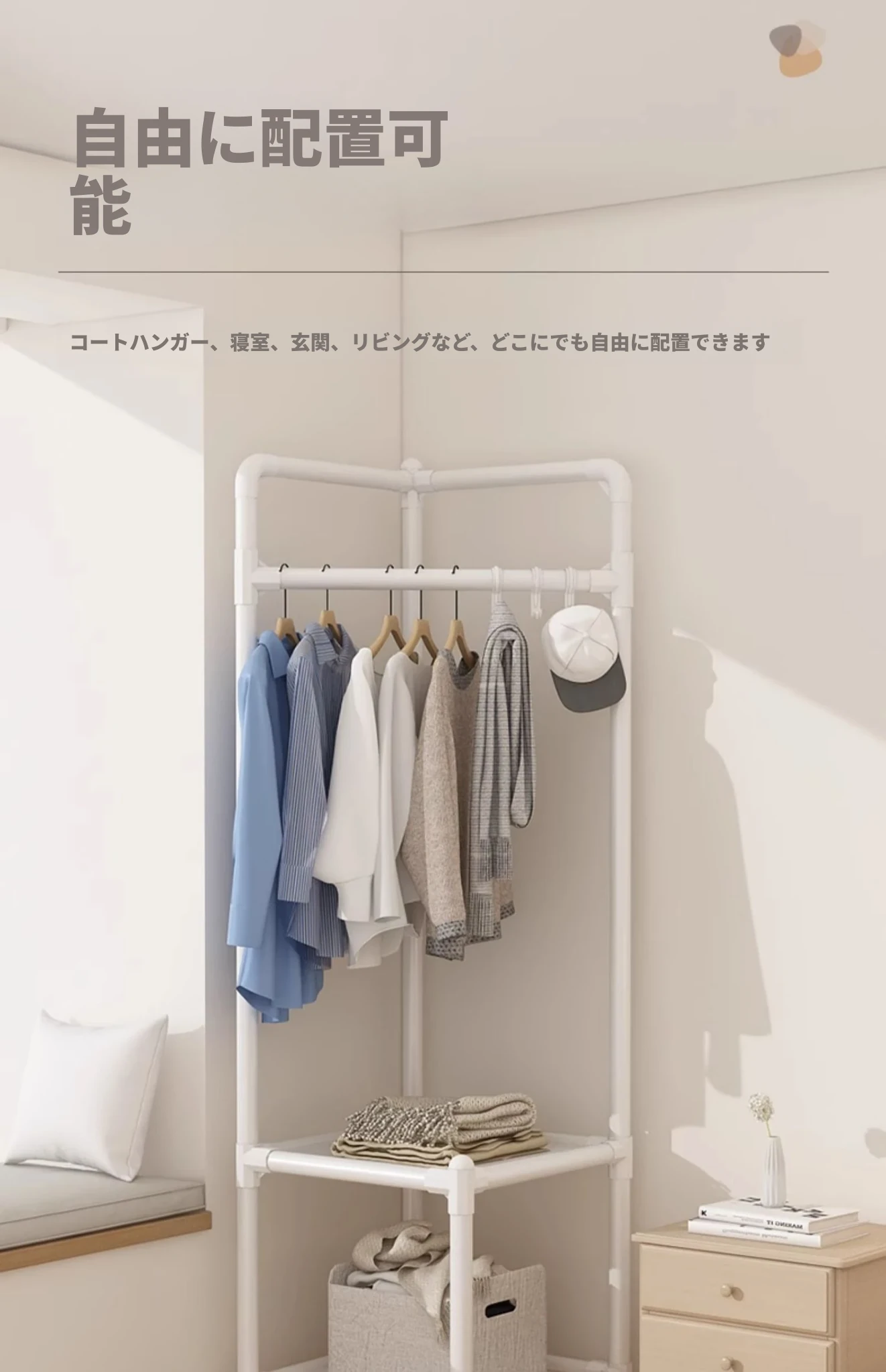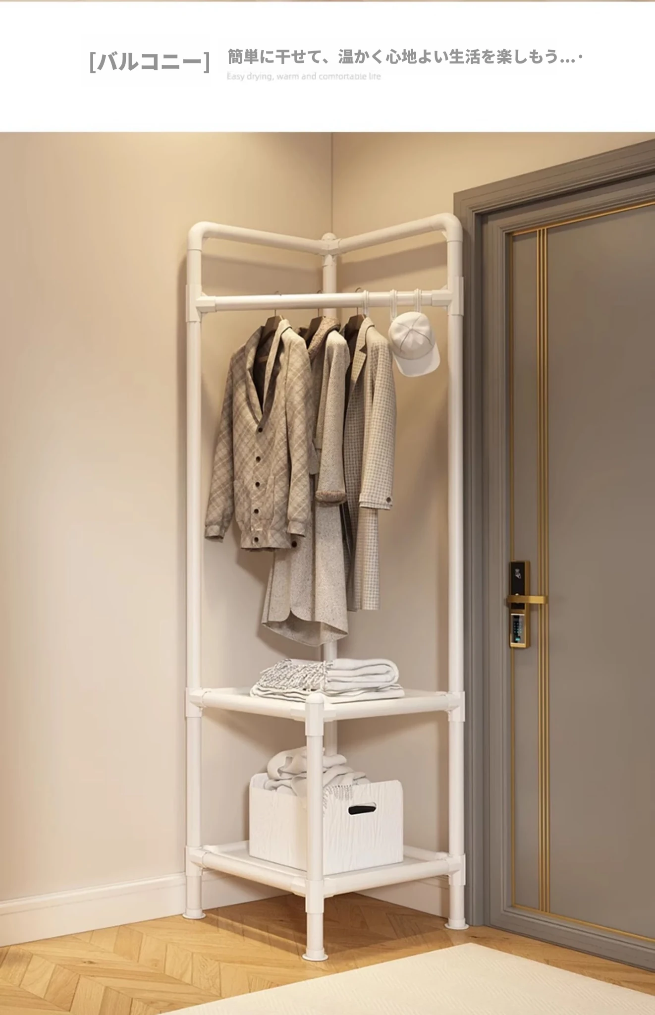 角に置ける便利な衣類ハンガー!寝室や玄関に最適な収納ラック。シンプルでスタイリッシュなデザインで、衣服や小物をすっきり整理。家族みんなのための必需品!