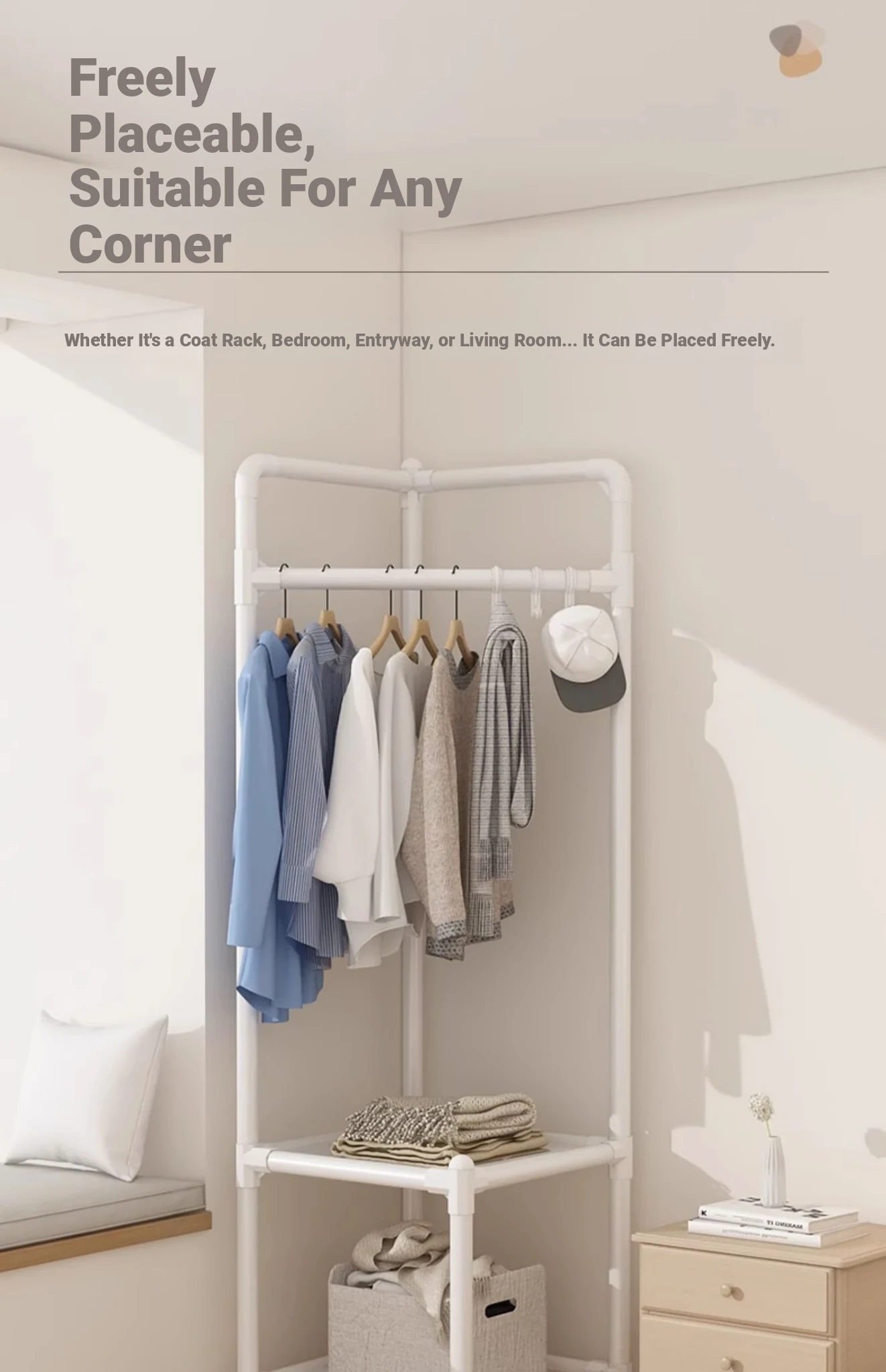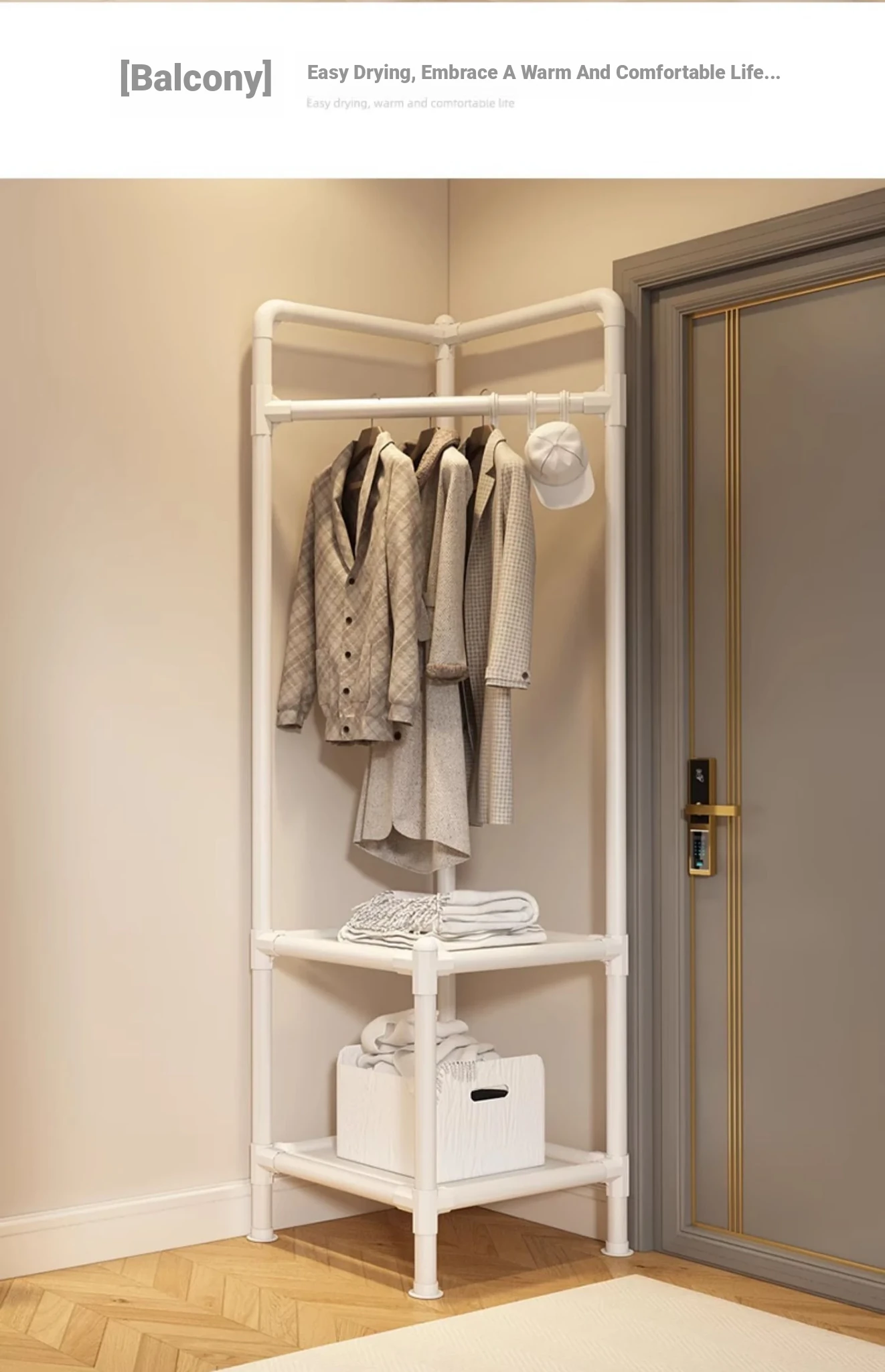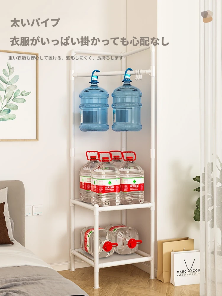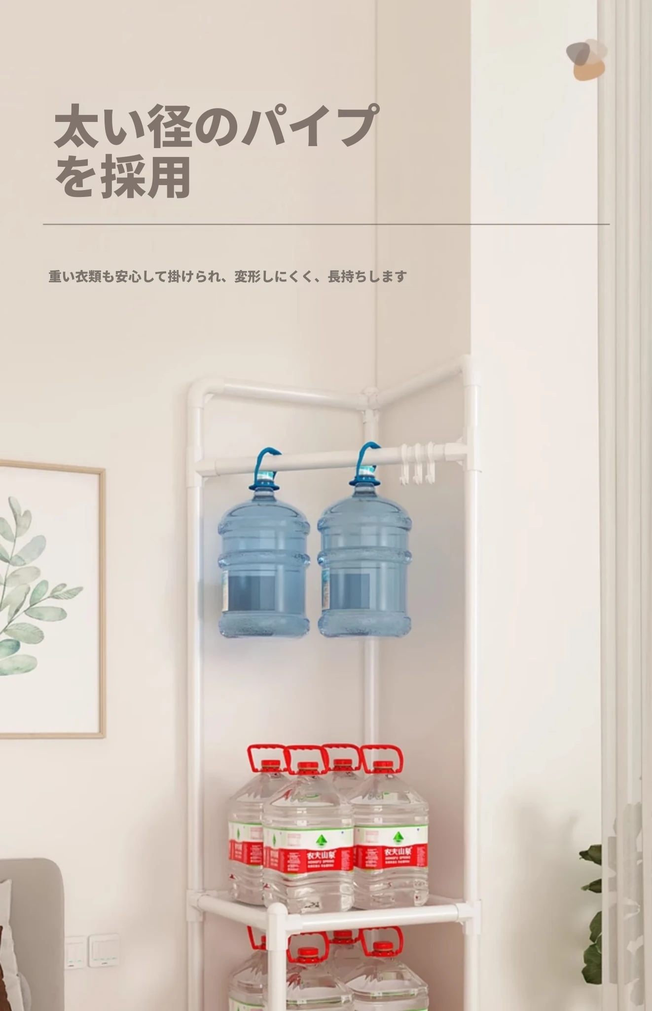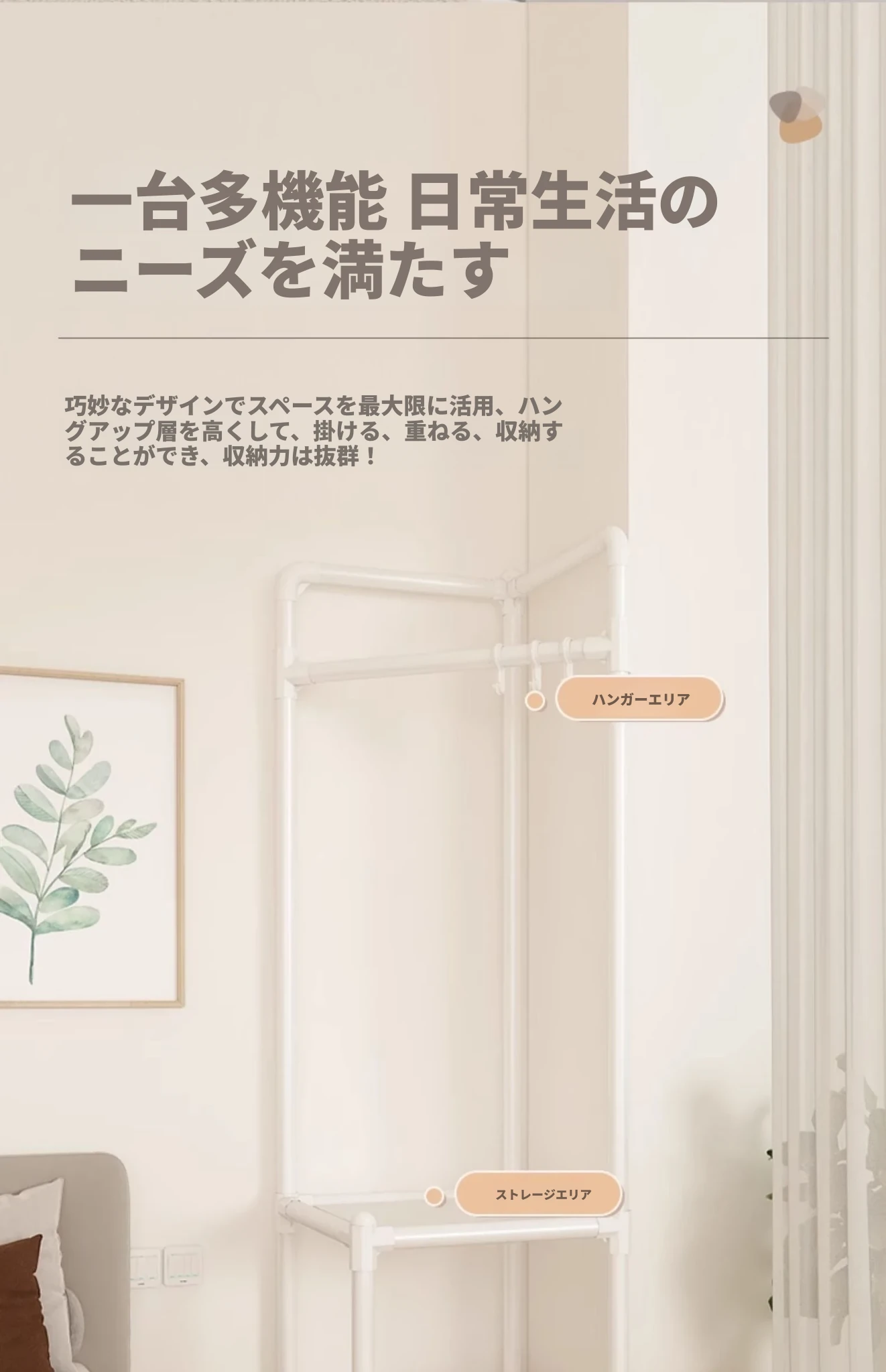 角に置ける便利な衣類ハンガー!寝室や玄関に最適な収納ラック。シンプルでスタイリッシュなデザインで、衣服や小物をすっきり整理。家族みんなのための必需品!