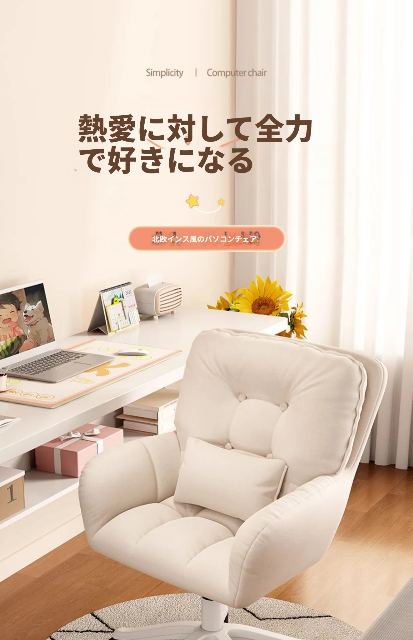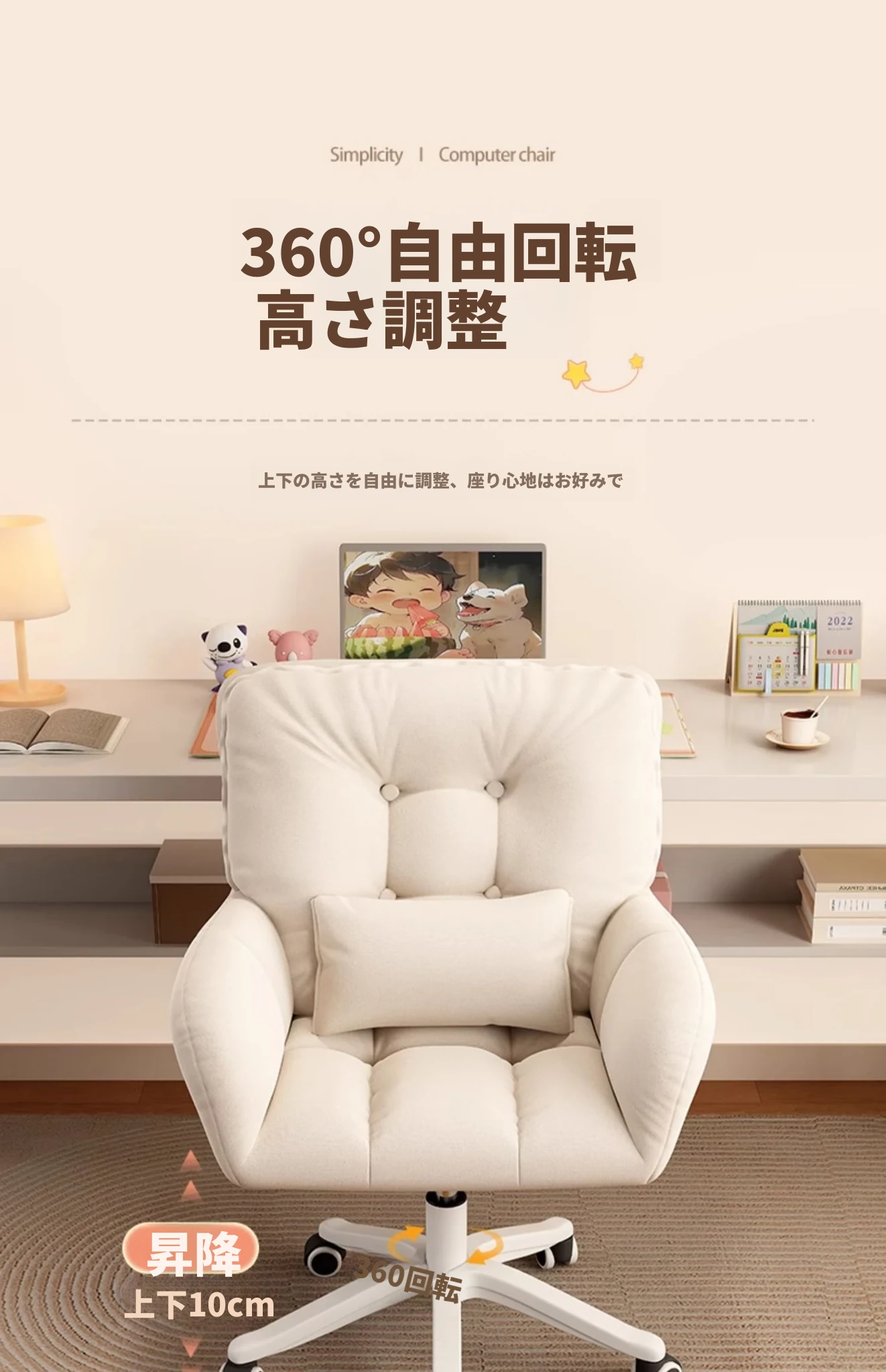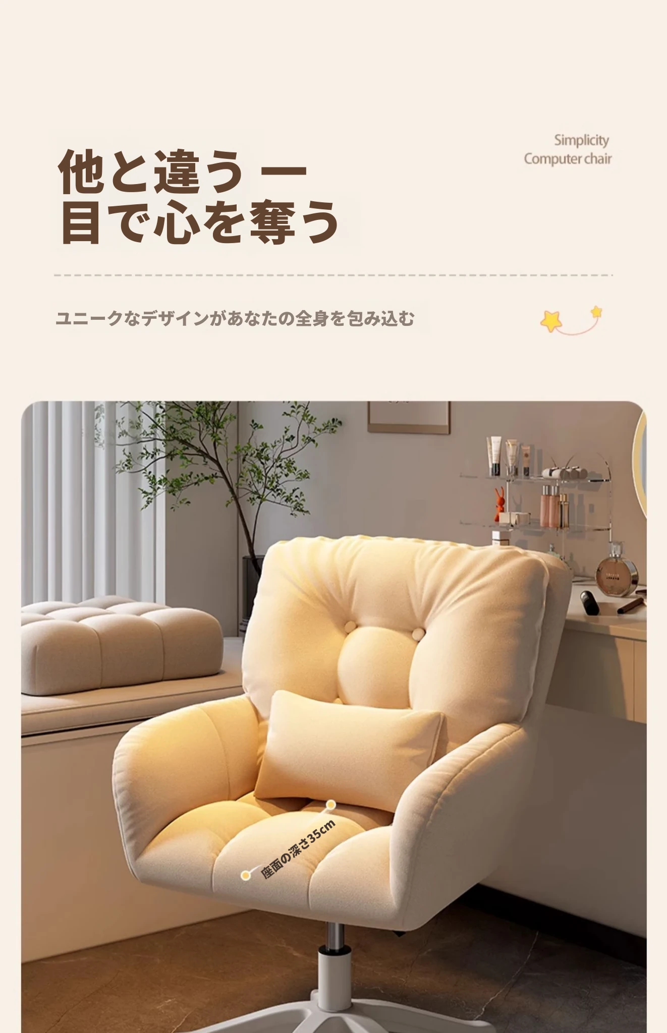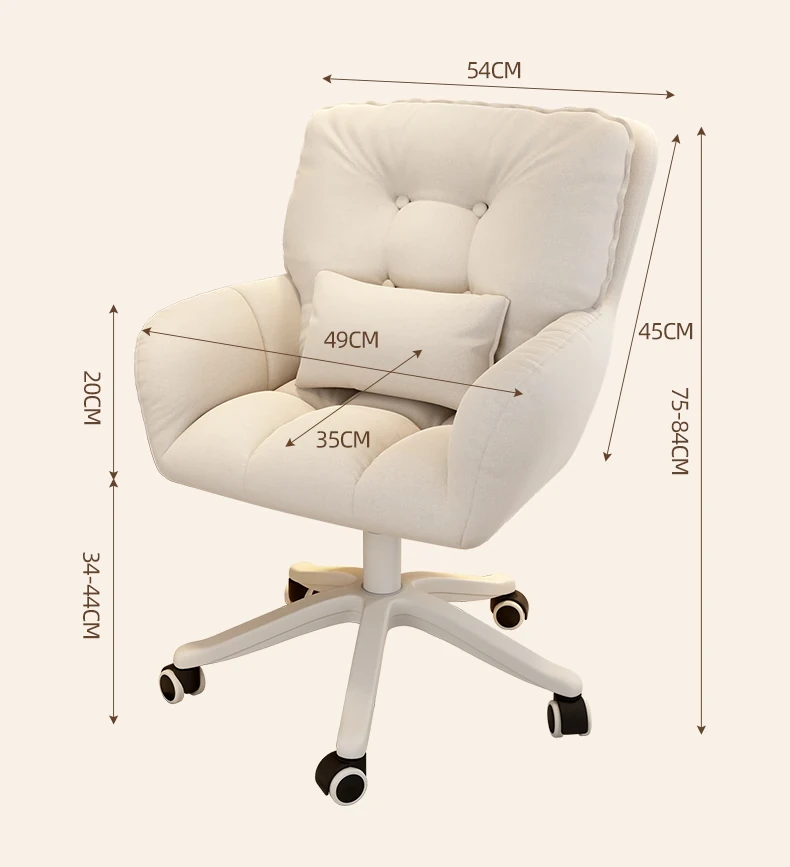 おしゃれな女性向け化粧椅子 - 軽やかな高級感!インスタで大人気の回転式背もたれ付きコンピューターチェア、ネイル作業にも最適なデザイン。あなたの寝室を素敵に彩るアイテムです!