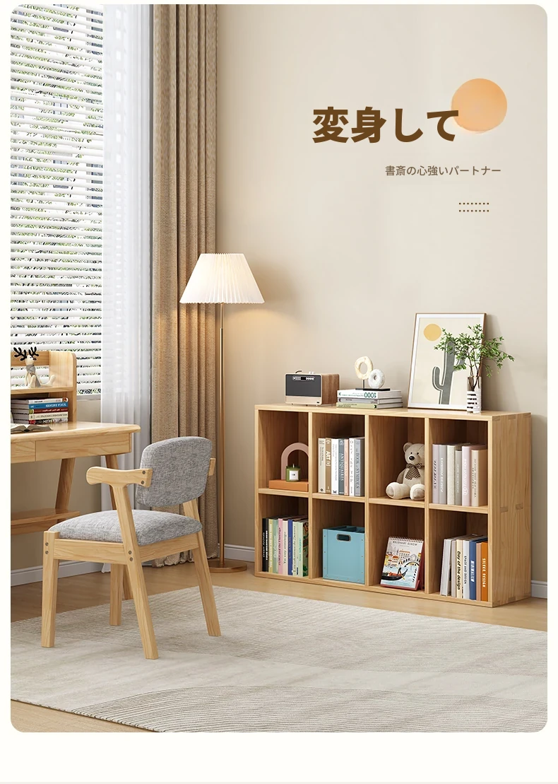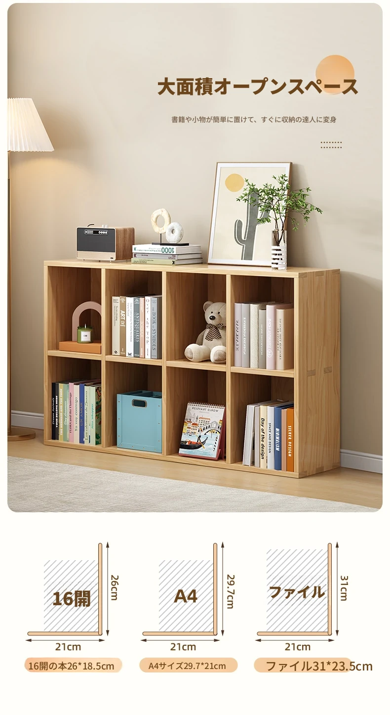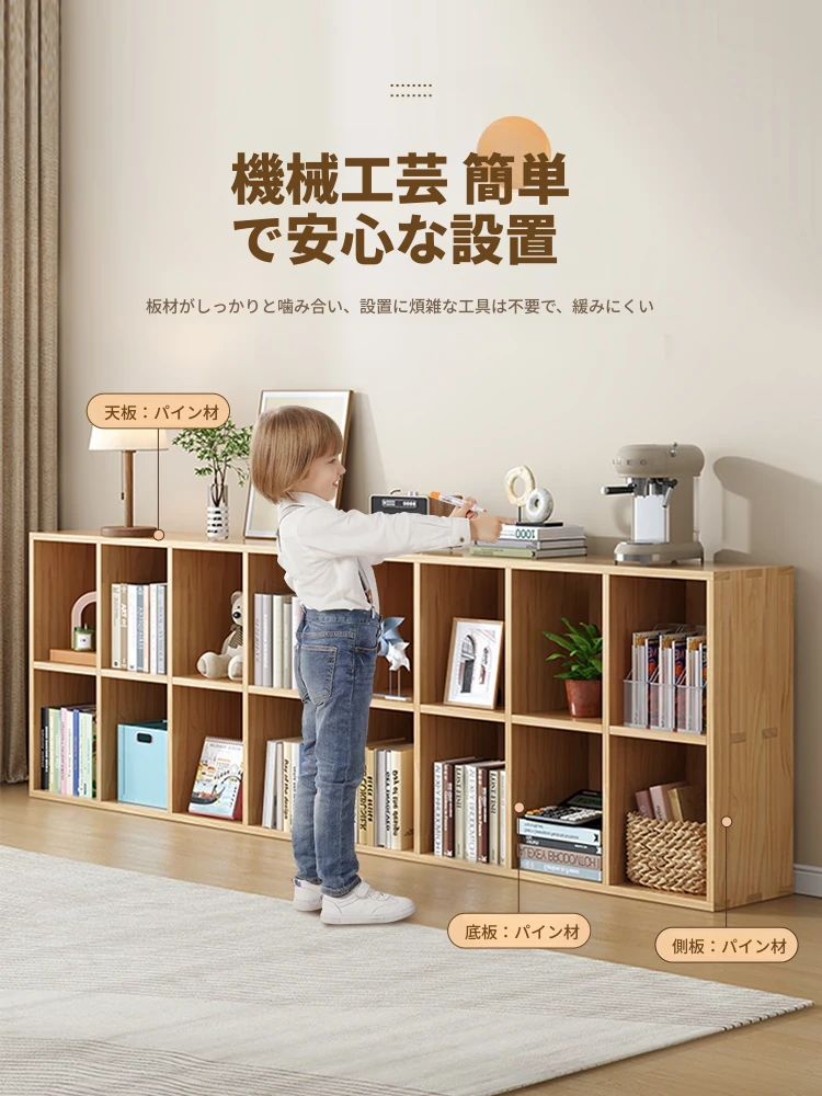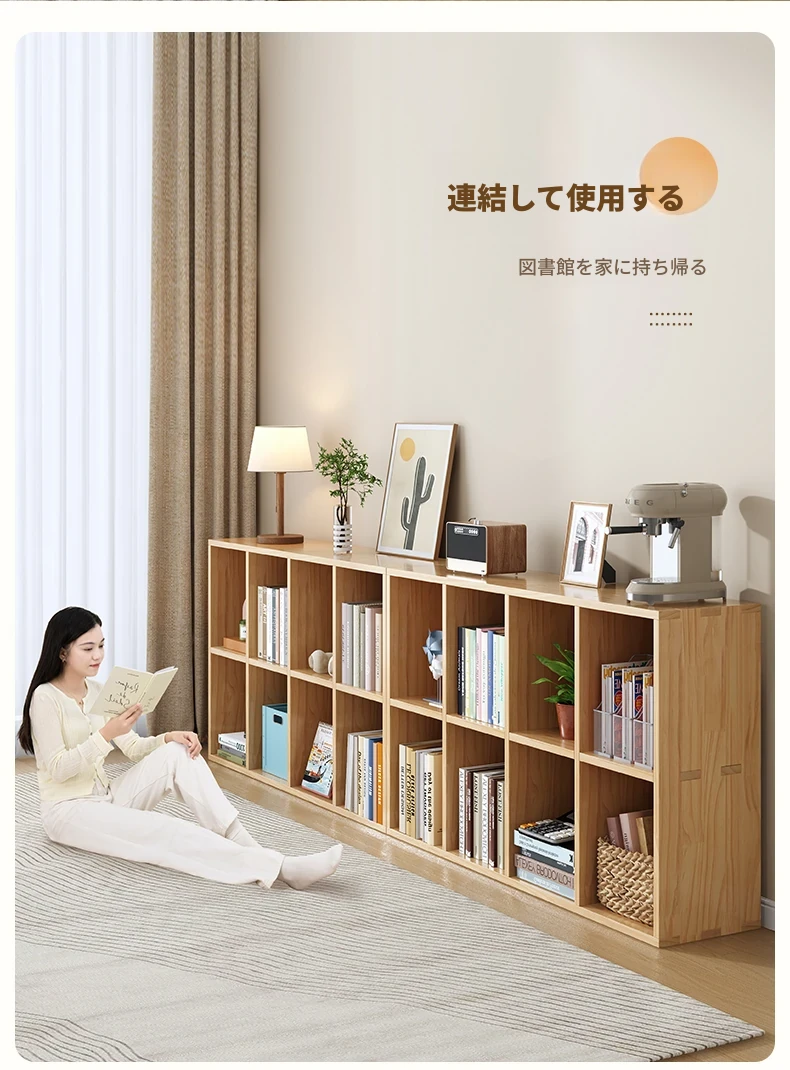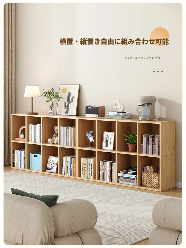 天然木製のフロア本棚 - リビングにぴったりな低めの収納キャビネット!子供部屋や幼稚園にも最適なコンビネーションストレージ。美しいデザインで、すっきりとした空間を演出します!