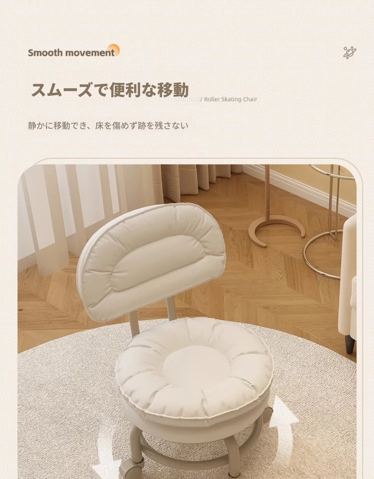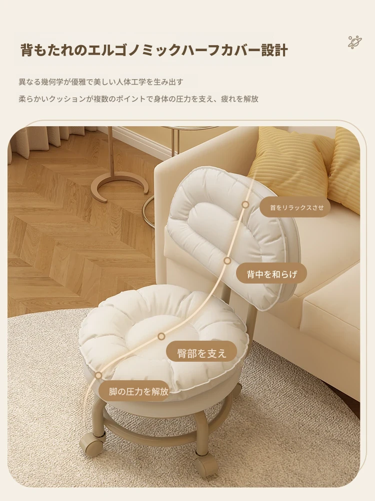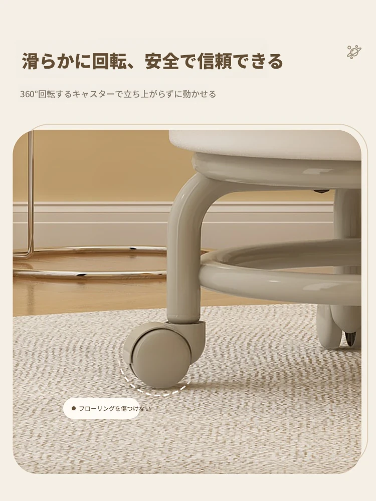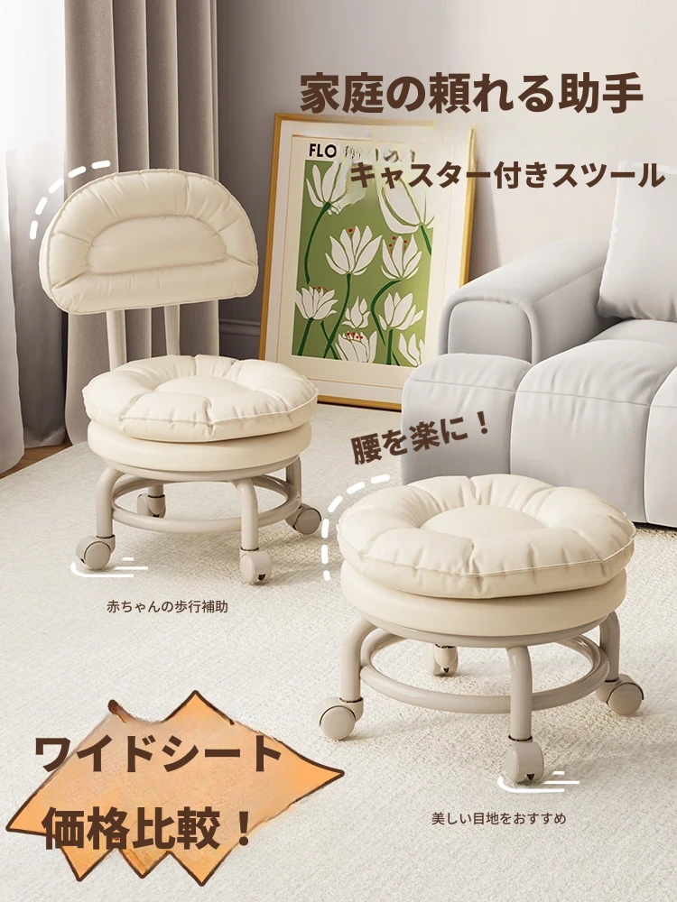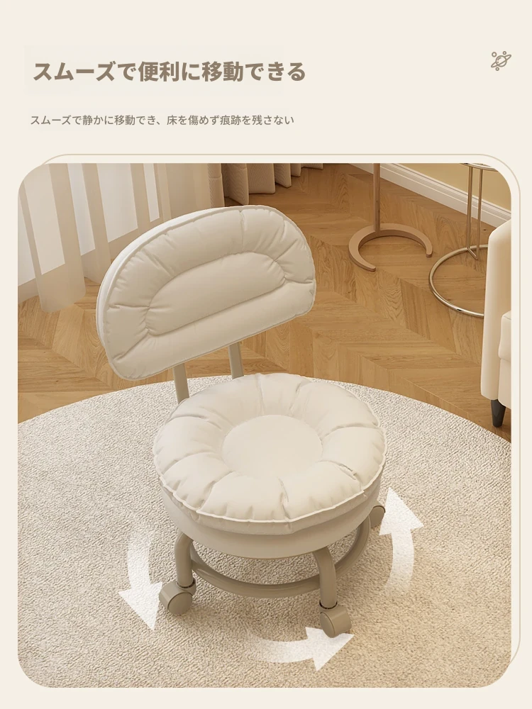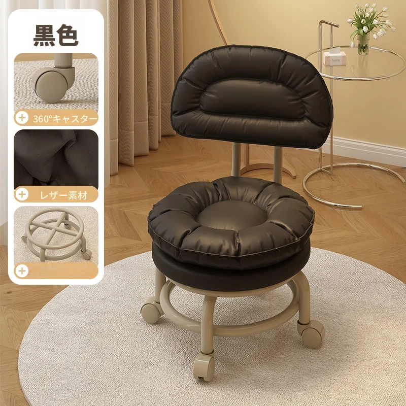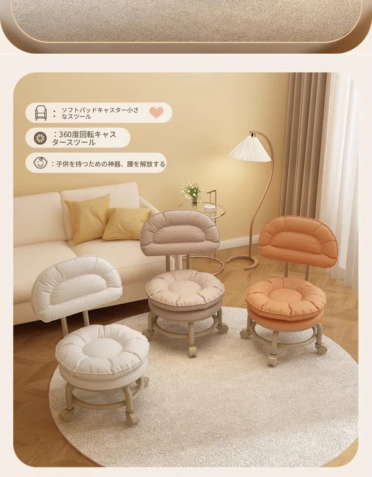 万能キャスター付きミニスツール!おしゃれで使いやすい!リビングや子供部屋にぴったりな背もたれ付きのスツール。靴を履く時や玄関でも大活躍!家庭用の円形スツールで、どんなインテリアにもマッチ!