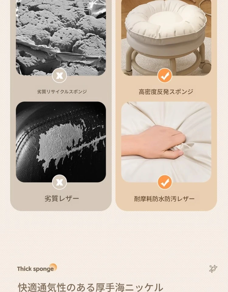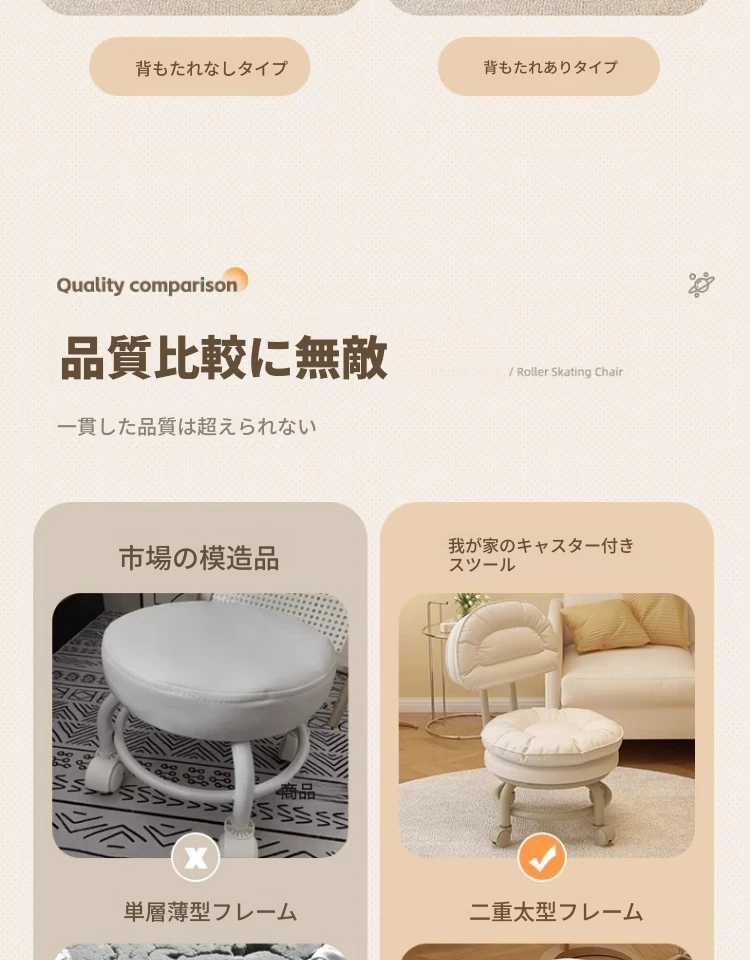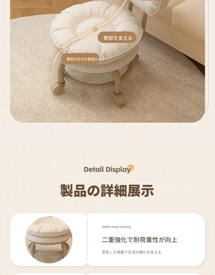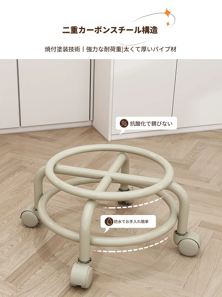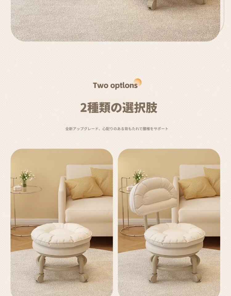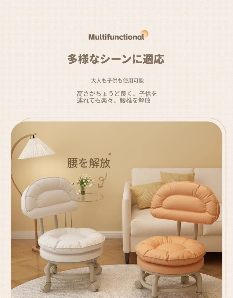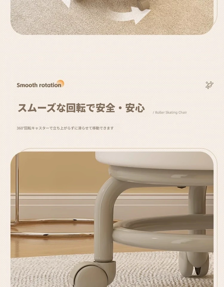 万能キャスター付きミニスツール!おしゃれで使いやすい!リビングや子供部屋にぴったりな背もたれ付きのスツール。靴を履く時や玄関でも大活躍!家庭用の円形スツールで、どんなインテリアにもマッチ!