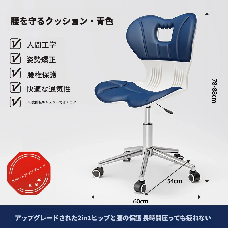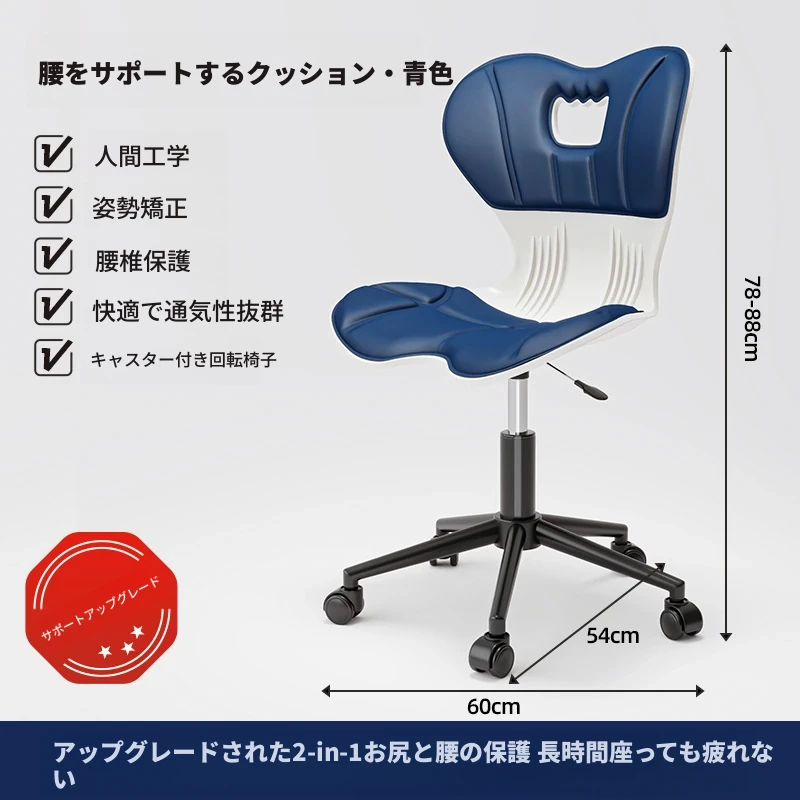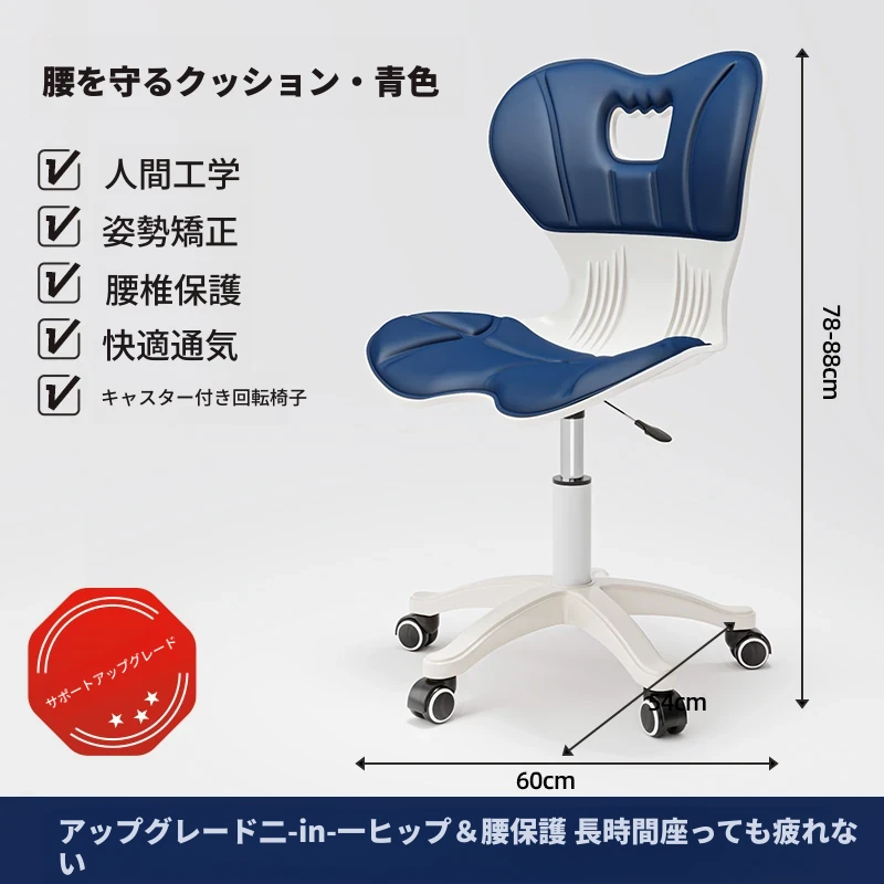 ステンレスブラックのフレーム✨ブルー✨快適な腰サポート-効率的な脊椎圧力緩和